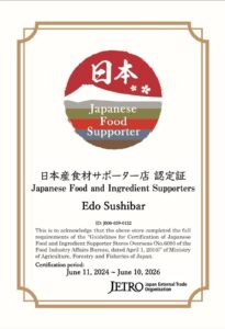il nostro ristorante ha ottenuto il prestigioso certificato di Japanese Food Supporter. Questo riconoscimento, conferito dal Ministero dell’Agricoltura, delle Foreste e della Pesca del Giappone, attesta il nostro impegno nell’utilizzo di ingredienti giapponesi autentici e di alta qualità.